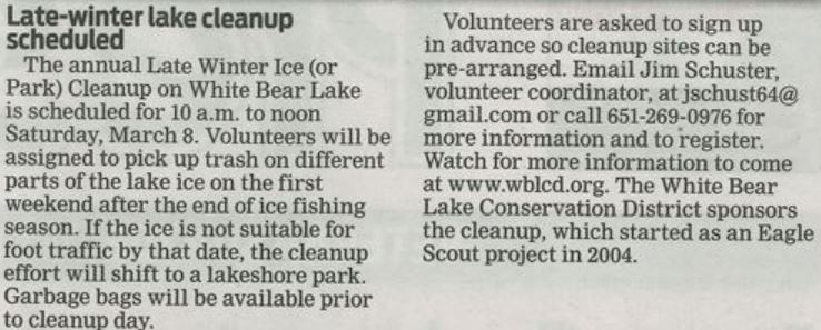 - Sat. Mar. 8 - 22nd annual Late Winter Ice Cleanup, 10 am to noon. Click here for more information. Due to heavy snows and uncertain ice conditions, assigned groups will conduct an on-shore cleanup at any time up to and including March 15.
